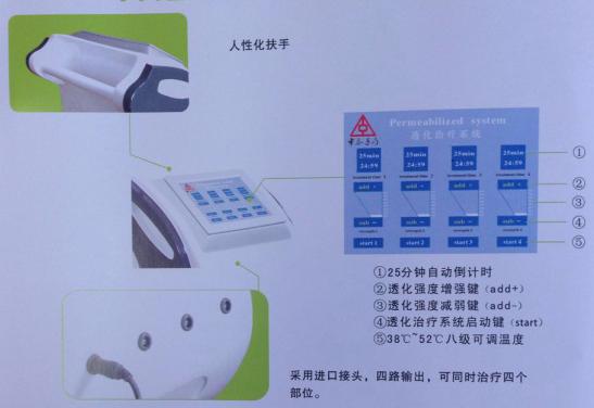 透化系統優點: 中醫定向透化系統分為兩部分:主機+透化墊 主機部分:四路輸出、全觸屏一鍵式操作、微電腦控制系統,八檔可調溫度,輸出電磁電熱穩定可調、透化頭溫感探頭,保證安全有效。透化頭采用醫用硅橡膠,無毒無味。綠色環保,避免接觸性過敏等傷害。表面易清洗,可避免交叉感染。機身ABS工程材料、抗震耐用、四角定滑輪方便移動等優點。 透化墊(中醫定向透化墊)部分:采用導電電極片,為親水高分子凝膠劑型,與硅膠電極片相比,保有水分擁有更佳的導電性,擁有藥庫結構可真接承載藥液使用,減少了操作環節與治療時間。親水凝膠擁有與皮膚相宜的PH值,親膚性好,致敏率低。主體材料經過GB/T 16886-2000醫療器械生物學評價,無細胞毒性,無致敏,無刺激;可承載水溶、脂溶藥物成份,將三十多種中草藥提取物,進行技術處理后,與中醫定向透化墊融為一體,配合透化主機進行透藥治療,單項導入深度和寬度均可達8-10cm從而達到快速治療疾病的目的。