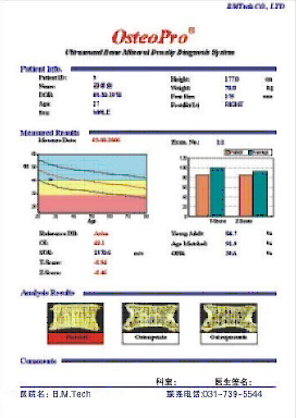 本儀器應用廣泛,用于疾病的診斷和預防。產品可用于婦幼保健院,兒童醫院、婦產醫院、老年病醫院、康復醫院、骨科醫院、體檢中心,健身中心,營養品廠商,鈣片廠商,藥店等醫院。報告適用于對骨質進行超聲診斷檢查,并可提供各項參數,為醫務人員診斷提供依據。