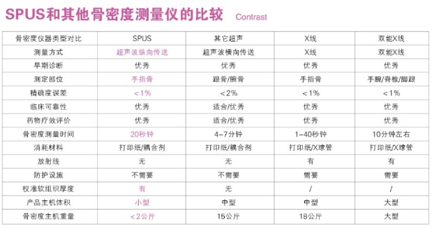 SPUS超聲波骨密度測量儀,是超聲波指骨檢測骨密度儀新產品,是世界上第一臺采取縱向傳播獨特專利技術的全新診斷儀,二百萬超聲波速度分析,全新人體科技概念,手指定點測量,便捷、準確,采用世界最小巧的超聲波探頭,掃描指骨10秒即可完成,免脫鞋、脫襪之尷尬,醫病互動最佳,病人容易接受。經美國Musslino8位骨質疏松領域權威專家對348145-74歲的人群16年隨訪,及國際臨床骨密度測量協會秘書長Sydney Loubonnick博士2002年最新發表的《骨密度測量技術》之明確指出,指骨是測量和診斷人體骨質疏松的有效部位,是預測髖骨骨折的有效部位;臨床可靠性好,價格適中,測量手指的中指骨部位非常方便,測量時間短,測量數據精確,無外部輻射。