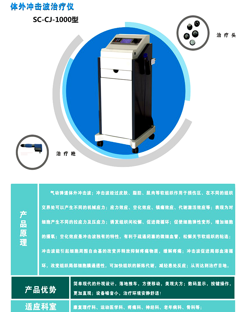 設備產生的沖擊波可以來改變傷患處的化學環境,使組織產生并釋放出抑制疼痛的化學物質。同時沖擊波可以破壞疼痛受損的細胞膜,抑制疼痛信號的產生與傳導。此外,沖擊波引致內腓肽的產生,降低患處對疼痛的敏感,以上幾種機制針對傷患的合成作用,可以對患者疼痛達到長期有效的治療效果。