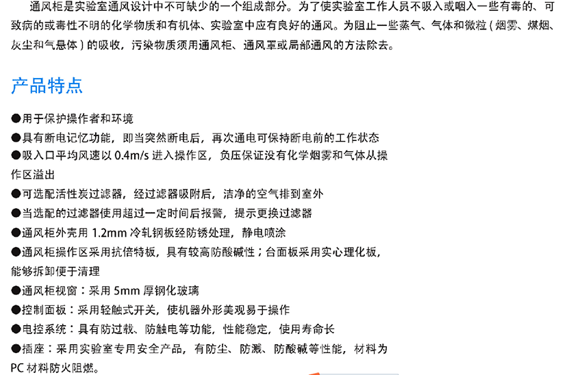 6、 功率: 800W本設備適用,適用于空調廠房超凈廠房的新型工藝設備,在電子、化工、機械、醫學等行業,及大專院校,實驗室也得到廣泛應用。通風柜在進行具有潛在危險或未知影響因素的實驗操作,進行產生易燃、易爆、易揮發的實驗操作,進行毒害品試驗等實驗操作。本設備可以用于保護操作人員和試驗產品的試驗過程中。