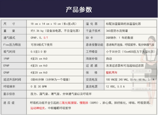 技術領先,功能強大自動調壓功能,實時檢測呼吸暫停、低通氣、打鼾以及氣流受限等呼吸事件,自動調節輸出壓力,時刻保持所需的最小治療壓力,極大地提高了患者的順應性RESlex? 呼氣壓力釋放技術,自動追蹤病人的每一次呼吸,讓患者獲得最大的治療舒適性獨特的靈敏度設置,給每位用戶提供切身的治療方式,獨享最大舒適;體貼設計,關懷備至液晶顯示屏,背景光設計,方便夜間使用,并顯示智能卡監測數據;自動開關機,報警功能強大,自動海拔壓力補償功能,漏氣補償功能超靜音設計;粉塵濾片和超凈濾片,防塵、防過敏;全新一體化InH2TM加熱濕化器,隨呼吸智能自動加熱,防返流設計,使用更安全