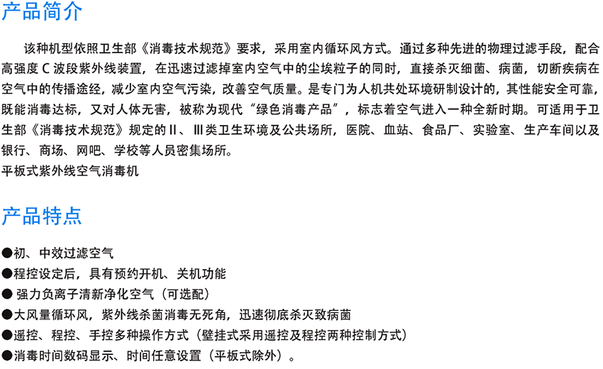 空氣凈化消毒器具有室內空氣殺菌消毒、降解有害物質等多項功能。本系列機配置有不銹鋼初濾網、活性碳纖維、納米二氧化鈦光催化網、紫外線殺菌燈、負離子發生器、臭氧發生器、智能化控制系統等。本產品有從初濾到完全凈化消毒多道程序,能在短時間內迅速殺滅空氣中的病毒和細菌,分解各種有害氣體,補充室內缺乏的負離子,是預防呼吸道傳染性疾病,防止病毒、細菌經空氣傳播,降解凈化室內有害氣體污染的高效率、高節能,新一代環保醫用空氣凈化消毒裝置。
