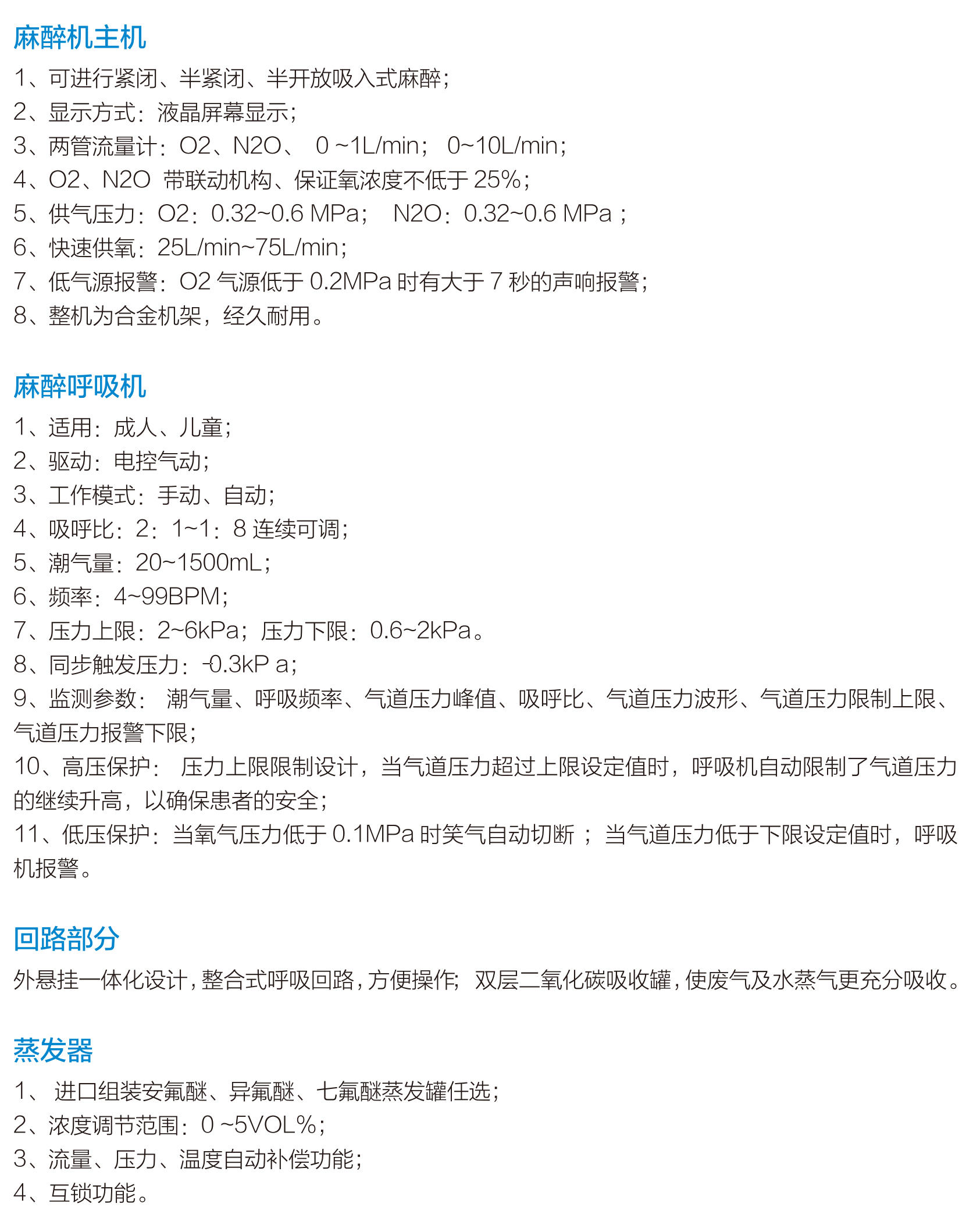 · 組裝型麻醉蒸發(fā)器兩只,內(nèi)部零件采用進口材料,氣密性好,先進的溫度、流量和壓力