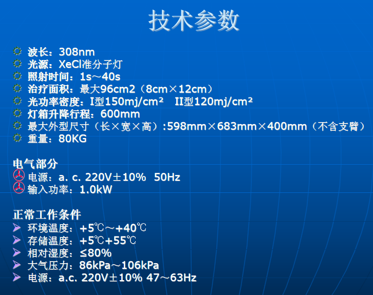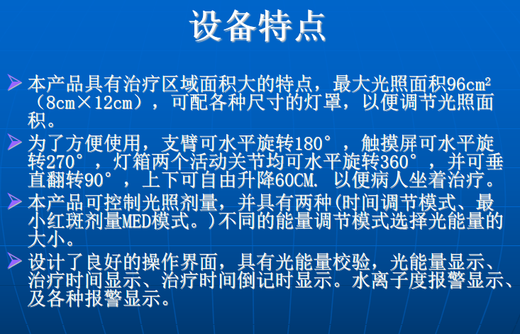 光源強度自動測量校準,智能評估光源的衰減情況并自動對強度值進行調整,實現精準的劑量治療模式 內置計時芯片,可采用計時器模式管理設備,適合于產品多種銷售合作模式