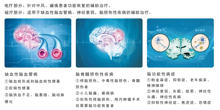 磁療部分適用于缺血性腦血管病、神經衰弱、腦損傷性疾病的輔助治療。電療部分(耳后)可改善腦部血液循環,適用于缺血性腦血管病的輔助治療。電療部分(肢體)可改善局部血液循環、用于興奮神經肌肉組織。該產品在醫療機構中使用,不用于焦慮、抑郁相關疾病的治療。