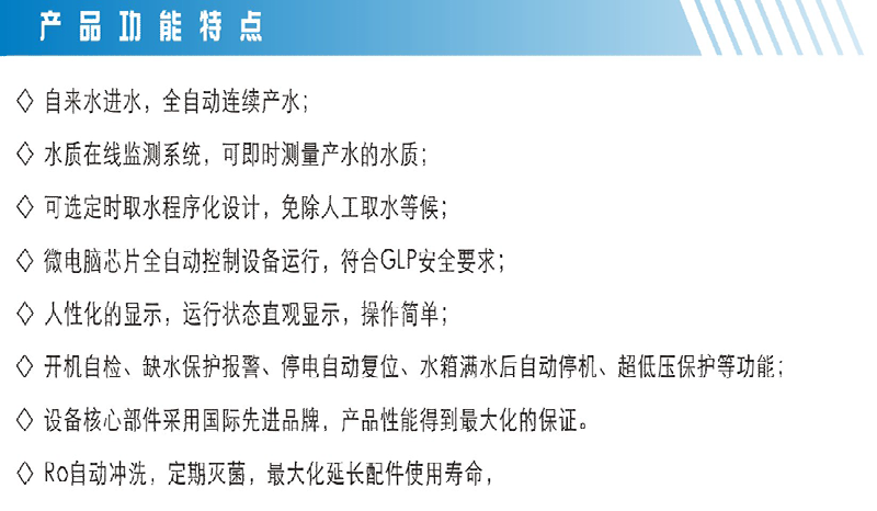 性能介紹: 電源:220v,50Hz;設備工作電壓:DC24v,功率:30W~300W(按機型有差別) 水源:市政自來水(進水水質(zhì)TDS<400mg/L,進水壓力:0.1-0.5Mpa),符合國標GB5749-2006的自來水. 反滲透脫鹽率:≥98%; PID控制程序,具有設定取水時間功能。 產(chǎn)出水電阻值和(或)電導率在線監(jiān)測系統(tǒng),采用不銹鋼電極,自動化量程,內(nèi)置數(shù)字化溫度補償功能。 微電腦控制,無人值守;水源無水不開機,斷水自動停機,壓力桶水 滿自動停機,壓力桶缺水自動開機; 具有先進的泄壓功能,開機強制自動沖洗反滲透膜。 大容量超純化柱,拋光樹脂裝填量≥4升。超純化柱采用專利的一次焊接成型技術。 RO和UP兩個取水口,可配備前后兩個UP水取水口可配備前后兩個UP水取水口。 水電兩路分開設計,確保安全。 可加裝液位開關,水桶水滿即停機。 一鍵式電控開關。