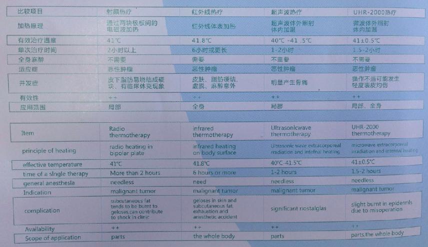 熱療是指利用生物熱效應使組織升溫,從而達到對腫瘤組織進行治療的一種方法。加溫與放療或化療聯合,對腫瘤療效的提高已被理論研究和臨床結果所證實,可以說這是針對腫瘤組織病理生理特點的特殊治療方法。由中國獨創,具有美國和中國專利技術的UHR-2000型微波熱療機引入了諸多創新技術,實現了微波技術可對深部組織和全身進行安全有效的加溫治療。由于采用該設備治療無脂肪過熱、且無須麻醉,因此臨床適用癥較廣。