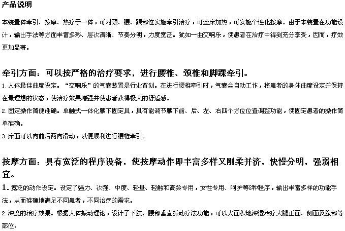 腰椎牽引,含自動間歇牽引、持續牽引、反復牽引,具有牽引力自動補償功能,配備腰部熱療功能,具有縱向牽引力及手動成角牽引功能(二維牽引功能)具有緊急復位裝置,加價500元可選配臥式頸椎牽引裝置。
