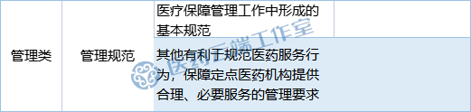 管理類規范包括醫保管理工作中形成的基本規范,以及其他有利于規范醫藥服務行為,保障定點醫藥機構提供合理、必要服務的管理要求。