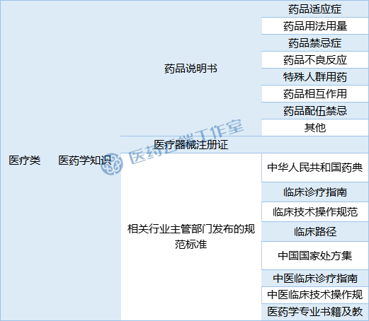 而在醫療類醫藥學知識中,包括了藥品說明書、醫療器械注冊證、相關行業主管部門發布的規范標準(包括藥典、臨床診療指南、臨床技術操作規范、臨床路徑、中國國家處方集、中醫臨床診療指南、中醫臨床技術操作規范、醫藥學專業書籍及教材等)