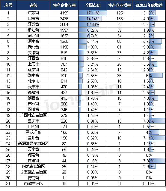 從生產范圍來看,可生產Ⅰ類產品企業數量排名前三的省份分別為廣東省(4159家)、山東省(3436家)和江蘇省(3004家);生產企業增量排名前三的省份為山東省(135家)廣東省(125家)和江蘇省(72家);從增速來看,重慶市和甘肅省可生產Ⅰ類產品企業增速最大,較2022年底增長7.32%,其次是貴州省7.14%。