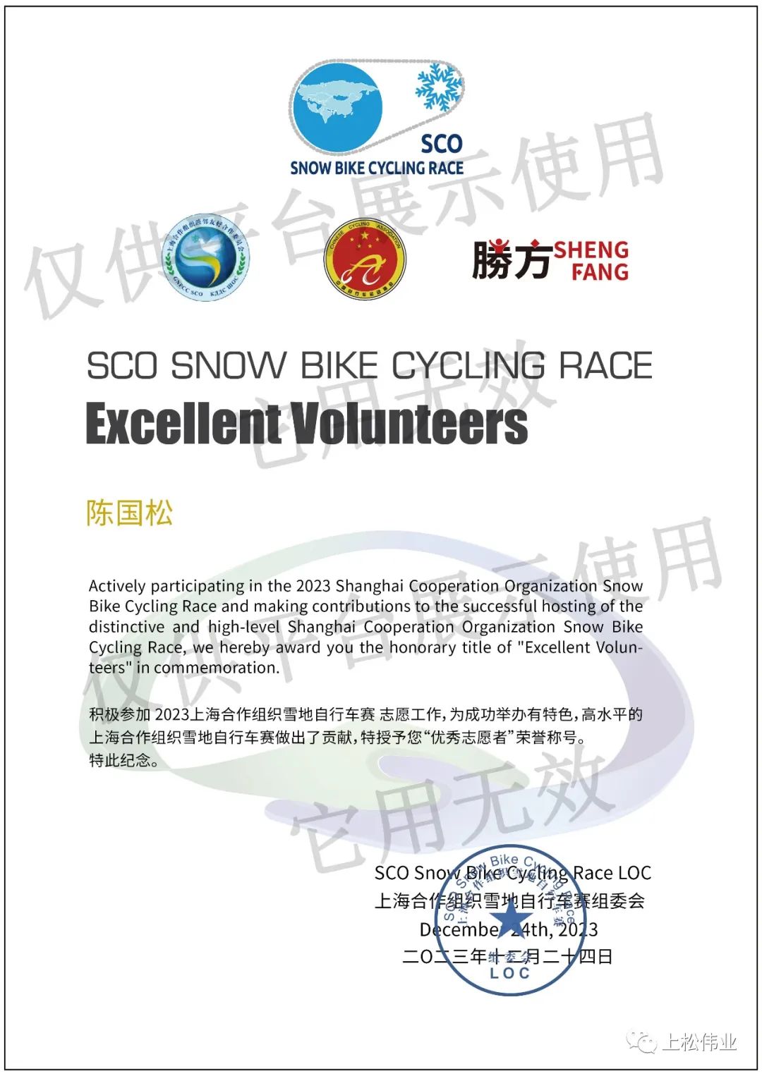 這里是哈爾濱,是“奧運冠軍之城”,是中國冰雪運動的發源地,也是中國雪地自行車賽的發祥地。2023上海合作組織雪地自行車賽落戶冰城,一切似乎是一場順其自然的巧合,而來自8個國家的自行車猛將也在這里展開了一場速度與耐力的比拼。我公司總經理陳國松同志積極參加此次活動并獲得“優秀志愿者”榮譽稱號。