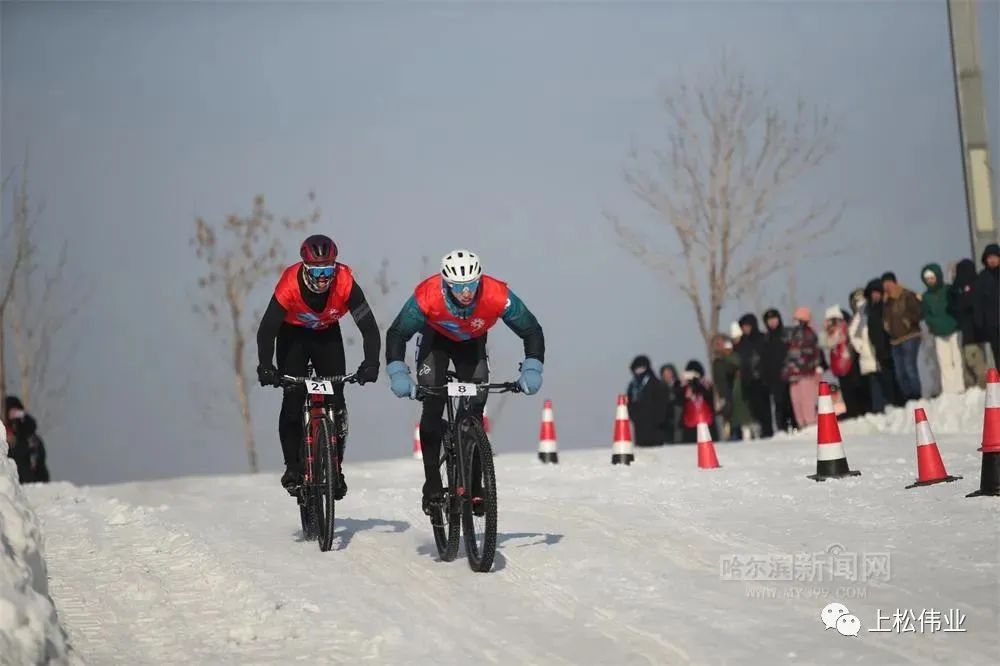 在冬日里的松花江畔,運動員們奮力騎行,向冠軍發起了最猛烈的沖擊,也在北國冰城的冬日暖陽里留下奮力騎行的汗水和身影。