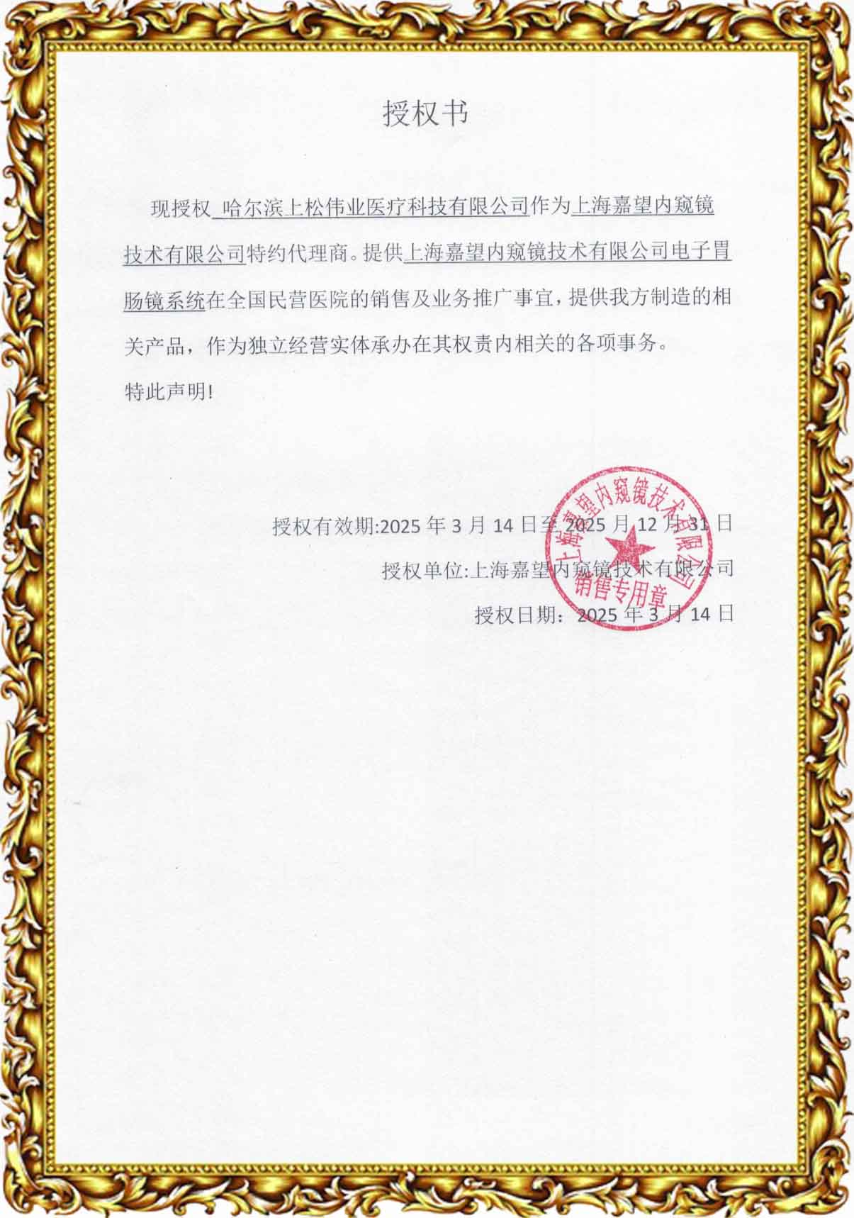 上海嘉望內窺鏡技術有限公司授權書