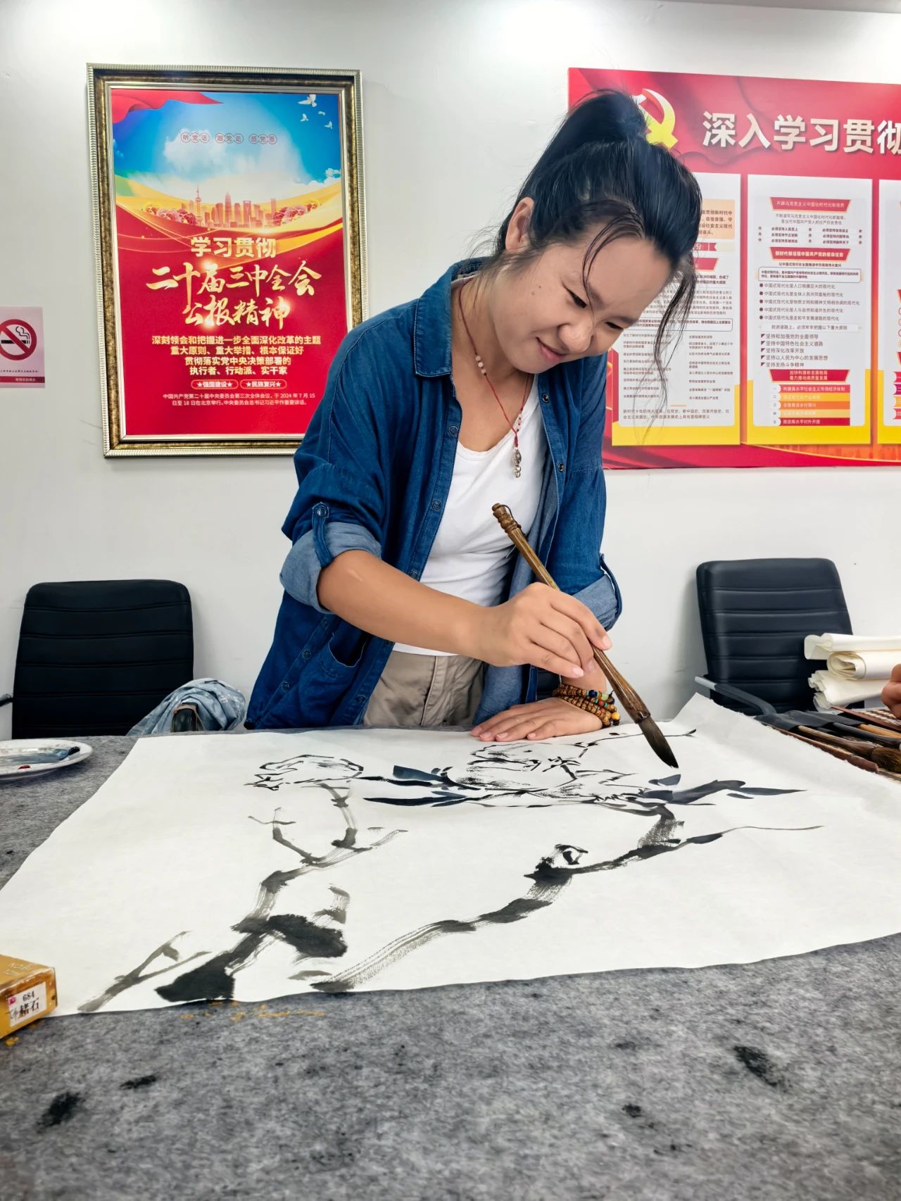 參加筆會的書畫家有中俄造型藝術研究院執行院長、國家一級美術師梁樹成,省、市書法家協會理事、誠信書畫院院長王剛、省美術家協會會員楊澤良、哈爾濱工程大學講師李冠男等書畫家,黑龍江省工信行業協會商會聯合黨委書記崔躍武應邀參加了筆會。活動現場氣氛莊重而熱烈,書畫家們以筆墨為媒,將對革命先輩的崇敬之情與對和平生活的珍惜之意融入創作,用藝術語言訴說歷史記憶。創作過程中,書畫家們相互交流心得,將對歷史的感悟、對未來的期許傾注于每一筆每一劃,現場作品題材鮮明、情感真摯。