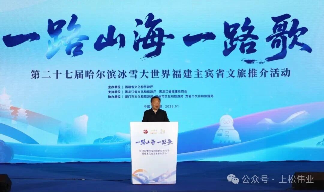 活動現場播放了文旅宣傳片《冰雪福緣》,發布“龍游福氣”旅游產品包,啟動“交換冬天·樂享福年”文旅惠民計劃,雙方文旅企業舉行集中簽約。“浪花慕雪白,樂享福年來”福建文旅圖片展、“福氣臨門,閩韻流芳”福建非遺展演等活動也同步開啟。福建省文旅廳廳長張源生、黑龍江省文旅廳廳長何晶,哈爾濱市委常委、宣傳部部長蘭峰,哈爾濱市政府副市長王波等兩省市相關領導,以及哈爾濱市、廈門市、漳州市、龍巖市文旅部門負責同志參加。黑龍江省福建總商會會長吳慶和、秘書長湯丹妮、上松偉業醫療科技(哈爾濱)有限公司總經理陳國松、上京偉業科技發展(北京)有限公司辦公室主任金慧亭以及其他部分企業代表參會,共同見證這場南北文旅融合的盛會。