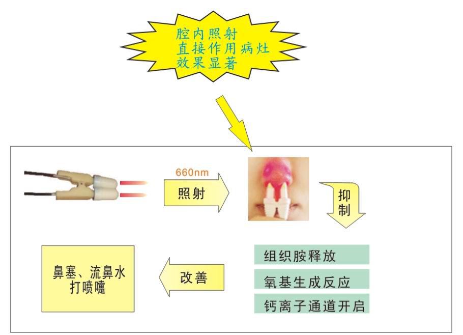 半導體激光部分采用現代生物光醫學技術,以波長660nm半導體激光,通過光纖傳導,直接照射作用于鼻腔的敏感區,引起血管擴張,流血加快,使鼻腔血系中,酶和蛋白分子構象發生改變而產生換能性生物效應。通過刺激鼻腔內交感神經和副交感神經,增強鼻粘膜血管收縮擴張彈性。并在直接殺滅鼻內腔表層病菌的同時,剝離血紅細胞表面包裹層,使細胞帶負電荷數量恢復正常;相互排斥力加大,把原來聚焦成團的紅細胞分散開。從而促進鼻腔血系發育及攜氧能力,增強鼻腔自身的殺菌免疫及再生機能,快速修復受損鼻黏膜,從根本上消除病癥,最終達到治愈鼻炎的目的。紅光使免疫細胞受體對花粉等刺激物的反應變慢;這種特定光波導致肥大細胞壁通透性減弱,這就意味著組胺的釋放量減少;免疫細胞的結合作用受到局部影響,從而降低了對過敏因子的反應。