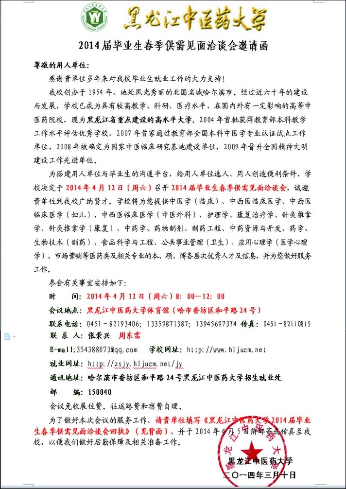 公司收到黑龍江中醫藥大學2014屆畢業生春季供需見面會邀請函