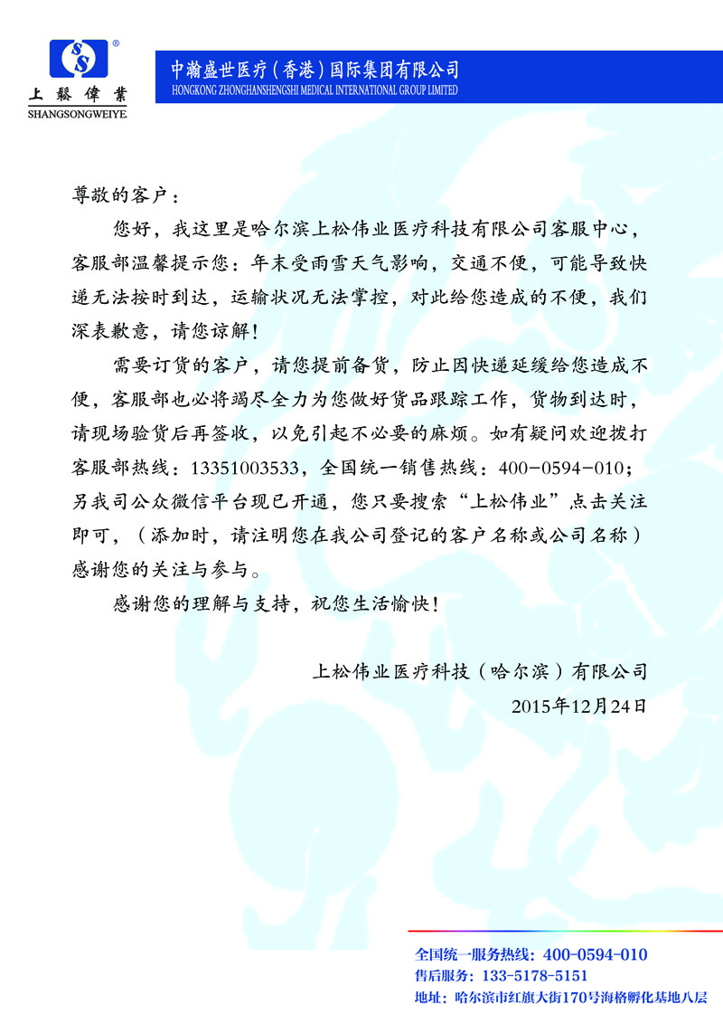 哈爾濱上松偉業醫療科技有限公司 傳真:0451-82280266 地址:黑龍江省哈爾濱市南崗區紅旗大街170號海格孵化基地8層