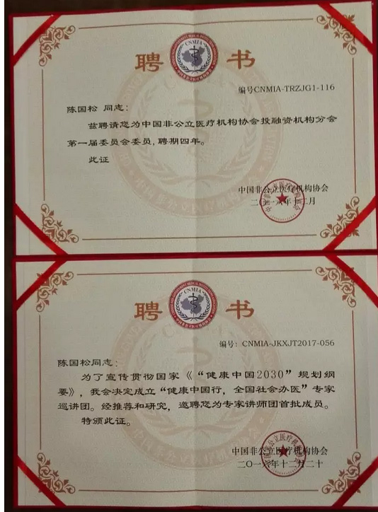 重磅:熱烈慶祝我司董事長陳國松先生受聘為中國非公立醫療機構協會投融資機構分會第一屆委員、全國社會辦醫專家講師團首批成員的殊榮!