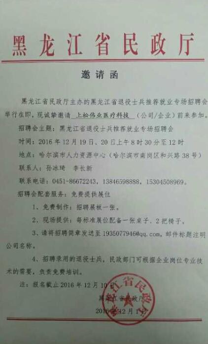 我司受黑龍江省民政廳邀請參加黑龍江省第五屆退役士兵推薦就業專場招聘會