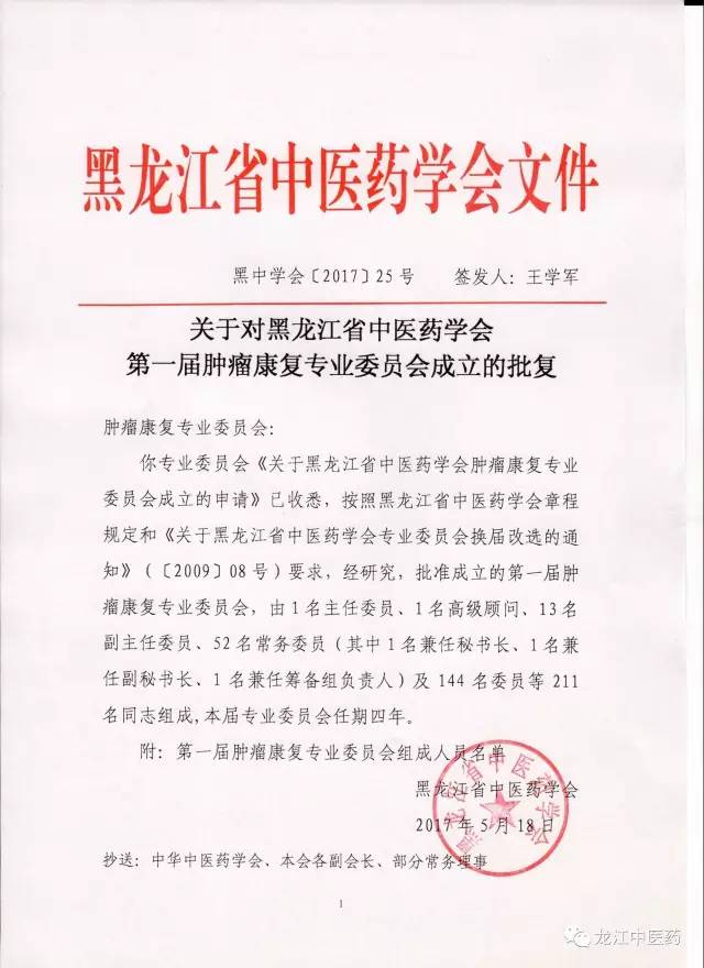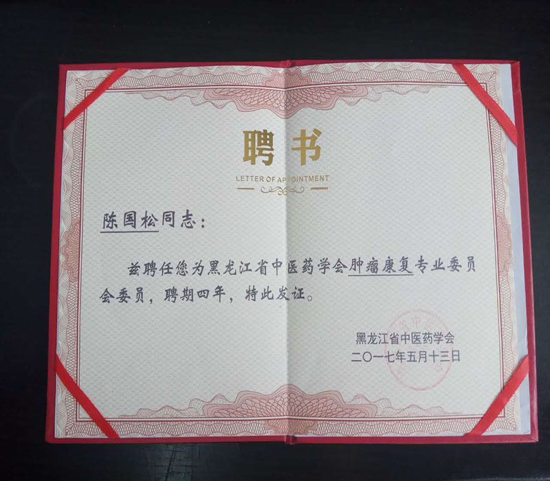 熱烈祝賀:我司董事長陳國松先生成為黑龍江省中醫藥學會腫瘤康復專業委員會委員