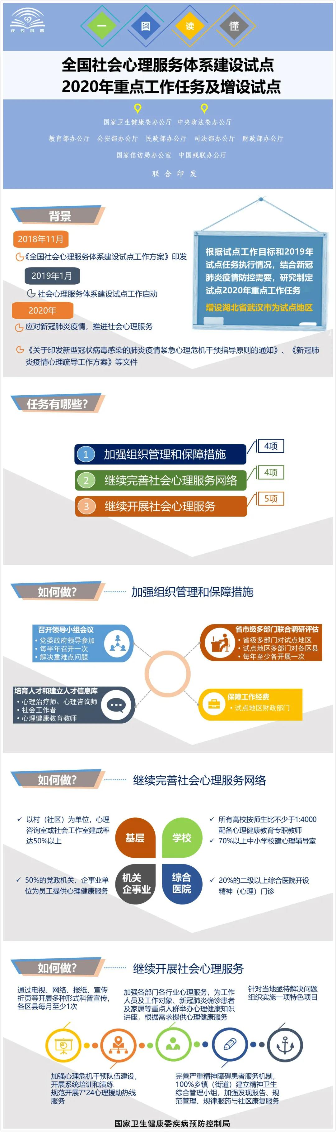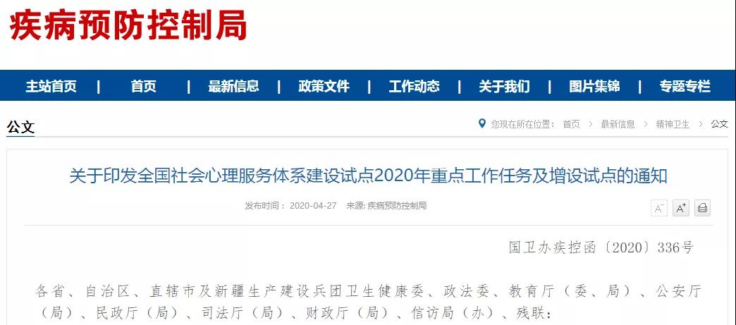 2020年4月26日,國家衛生健康委、教育部、中國殘聯等十部委聯合印發《全國社會心理服務體系建設試點2020年重點工作任務及增設試點的通知》。