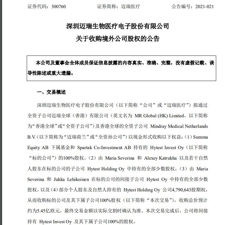 5月16日,邁瑞醫療發布公告稱:公司擬通過全資子公司邁瑞全球(香港)有限公司及香港全球的全資子公司Mindray Medical Netherlands B.V. 以現金形式收購Hytest Invest Oy(下文簡稱“海肽生物”)及其下屬子公司100%股權。