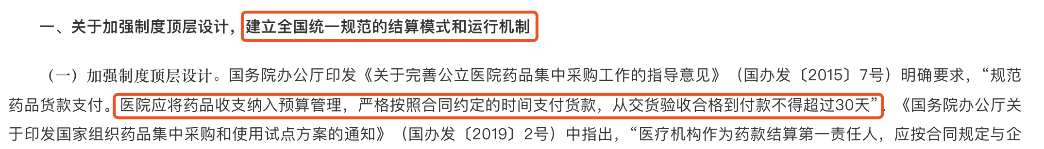 各地需要嚴格落實國務院辦公廳印發《關于完善公立醫院藥品集中采購工作的指導意見》(國辦發〔2015〕7號)明確要求,“規范藥品貨款支付。醫院應將藥品收支納入預算管理,嚴格按照合同約定的時間支付貨款,從交貨驗收合格到付款不得超過30天”。《國務院辦公廳關于印發國家組織藥品集中采購和使用試點方案的通知》(國辦發〔2019〕2號)中指出,“醫療機構作為藥款結算第一責任人,應按合同規定與企業及時結算,降低企業交易成本。嚴查醫療機構不按時結算藥款問題”。隨著國家組織藥品集中采購的制度化、常態化,對于提升藥品貨款支付效率的要求也在不斷提高;對無正當理由不按時支付醫保基金的醫保經辦機構負責人和不按時支付藥品貨款的醫療機構負責人,定期在全省范圍內通報批評;國家醫保局指出“保證及時回款”是降低企業成本,從而降低藥價的重要因素,各部門均高度重視,制定實施了一系列政策措施。各省份要相繼出臺了落實政策的相關細化規定,不斷加大對醫療機構貨款結算的監督力度,有效保證回款速度;國家醫保局指出,下一步將積極落實現有文件政策要求,不斷推進醫保基金與醫藥企業直接結算工作。擬對定點醫藥機構的考核評價中,逐步將定點醫藥機構按時結算藥款率等指標納入考核評價范圍。協調有關部門加強行業監管,要求醫療機構加強自律,及時結算藥款。