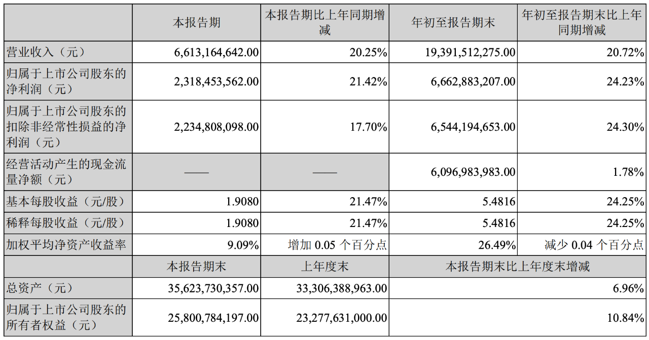 報告顯示,2021年前三季度,公司實現營業收入193.91億元,較上年同期增長20.72%。實現歸屬于上市公司股東的凈利潤66.62億元,較上年同期增長24.23%。