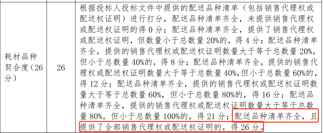 按照100分的分值計算,耗材品種的契合度獨占26分。只有企業(yè)配送品種清單齊全,且提供了全部銷售代理權或配送權證明的配送企業(yè),才能獲得滿分。