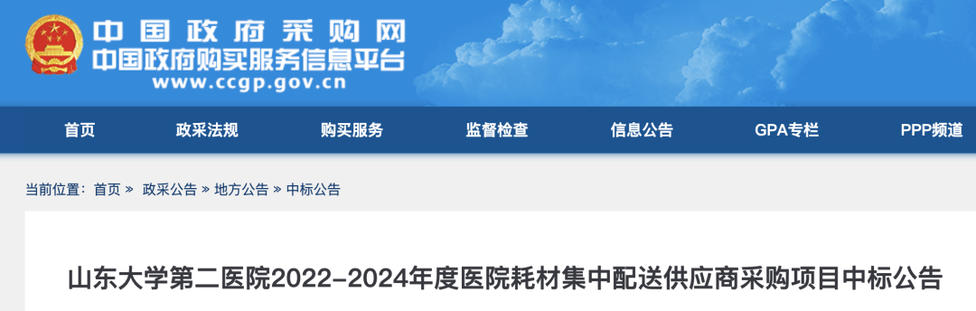 日前,中國政府采購網(wǎng)公布了《山東大學第二醫(yī)院2022-2024年度醫(yī)院耗材集中配送供應商采購項目中標公告》(以下簡稱公告)。
