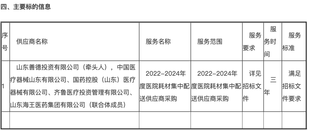 中標供應商名稱為山東善德投資有限公司(牽頭人),中國醫(yī)療器械山東有限公司、國藥控股(山東)醫(yī)療器械有限公司、齊魯醫(yī)療投資管理有限公司、山東海王醫(yī)藥集團有限公司(聯(lián)合體成員)。