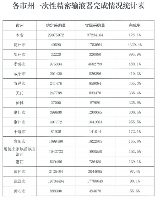 截至2022年6月,一次性精密輸液器類耗材執(zhí)行20個(gè)月,完成率為128.1%,絕大多數(shù)市(州)落地執(zhí)行較好,其中隨州市完成率高達(dá)4320.4%。